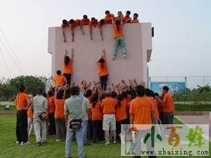 项目介绍:全体队员相互帮助翻过毕业墙、须全体通过,过了墙的队员不可以再返回帮助其他队友。不容许借助任何外力和工具,包括衣服、皮带等、用时最少的哪组为胜利队小~百~姓~网。